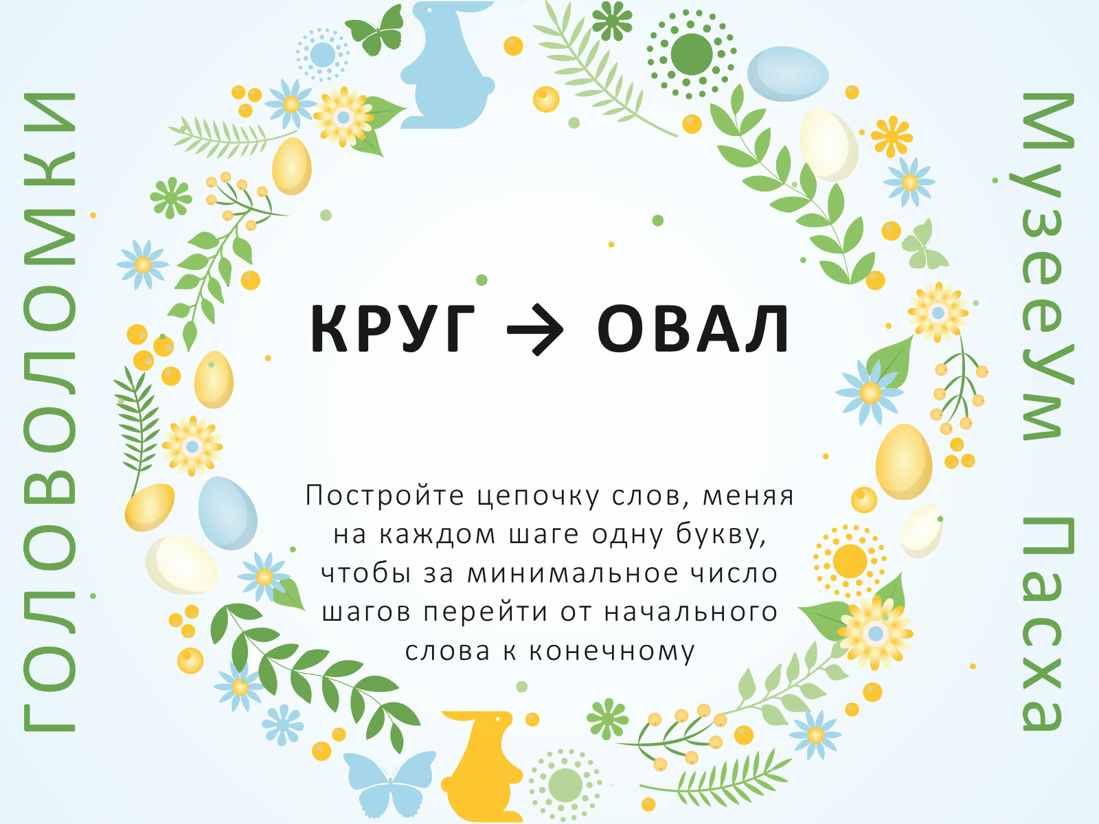 Постройте цепочку слов, меняя на каждом шаге одну букву, чтобы за минимальное число шагов перейти от начального слова (круг) к конечному (овал).